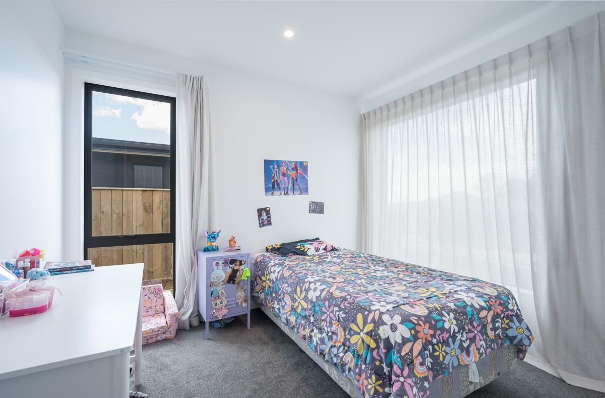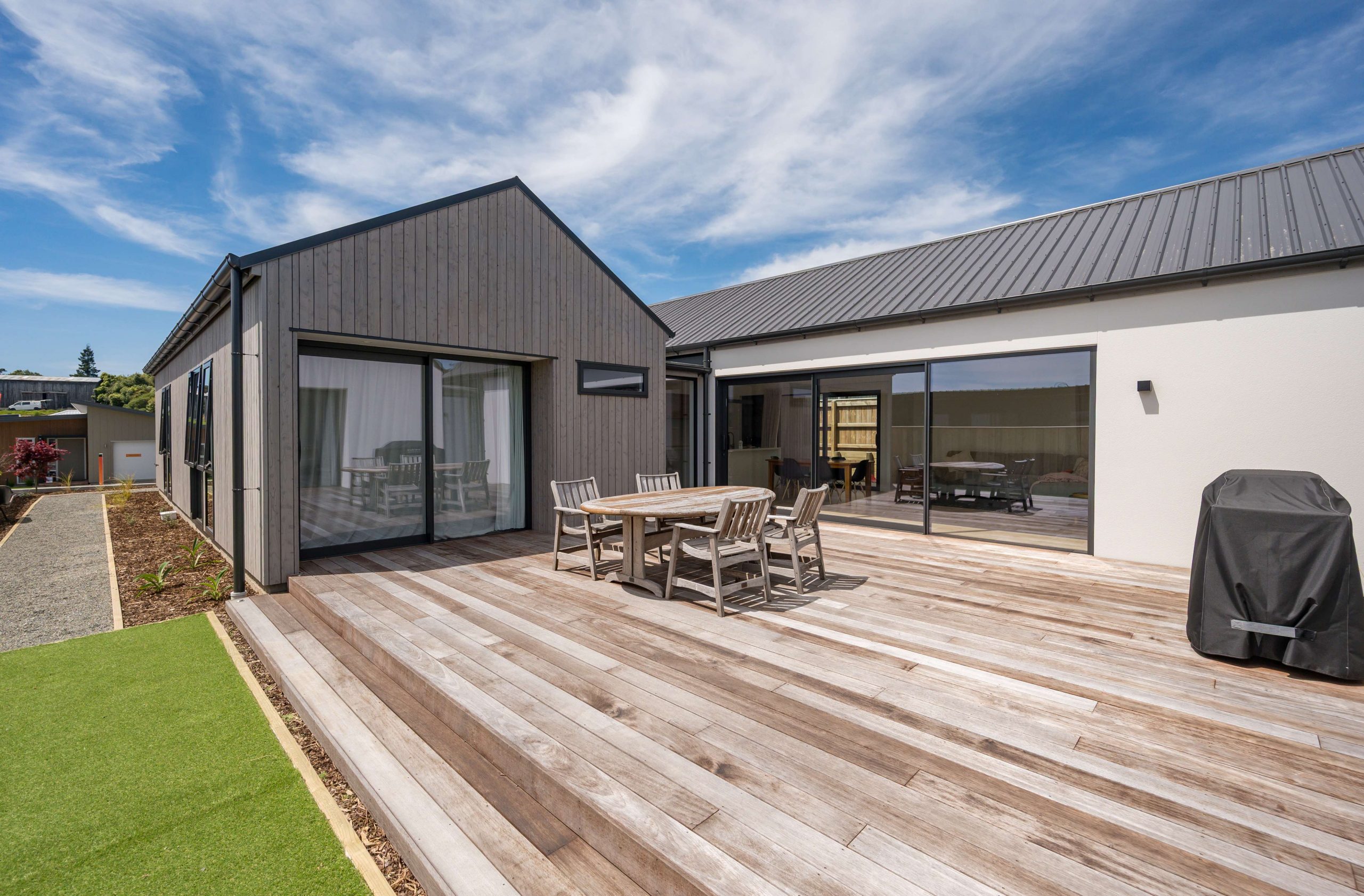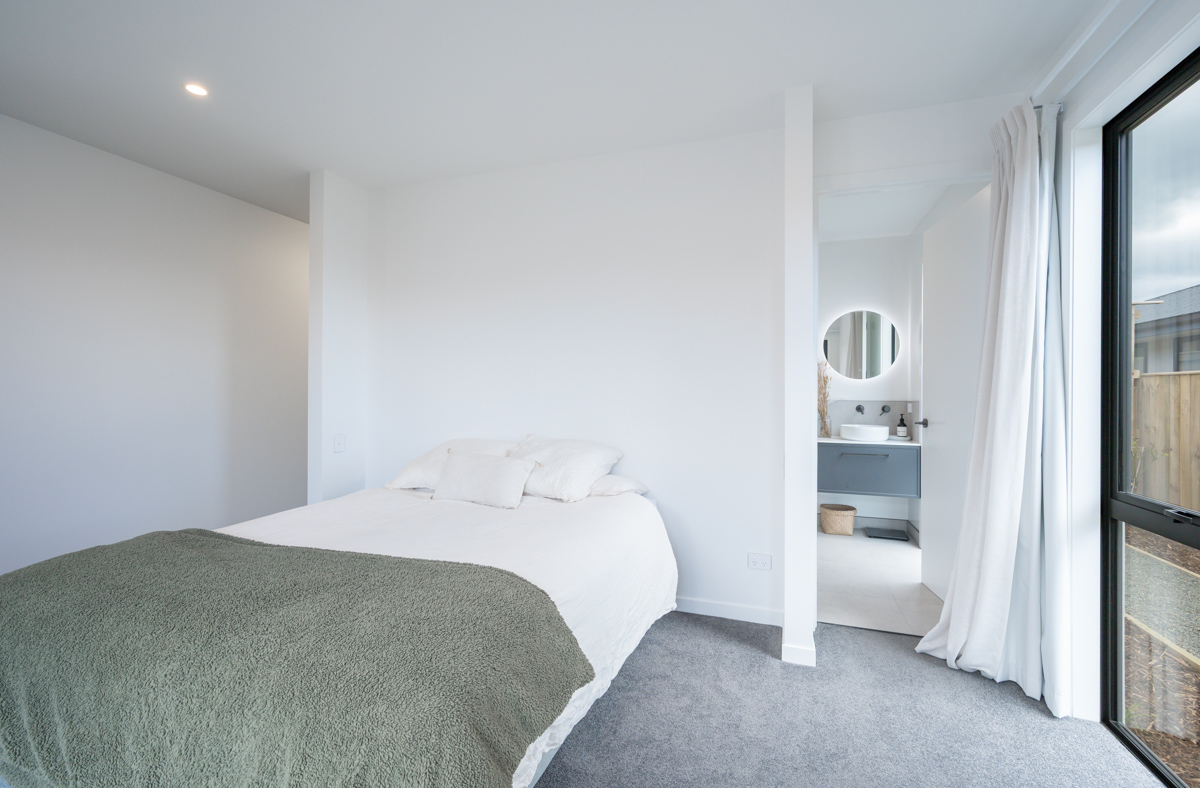 A separate second living area with a barn door and office nook provides flexibility for family living or quiet retreat. The clever floorplan offers three double bedrooms and a family bathroom in one wing, while the master suite enjoys its own private space, complete with a walk-in wardrobe, luxurious ensuite, and seamless flow to the sun-soaked Kwila decking.